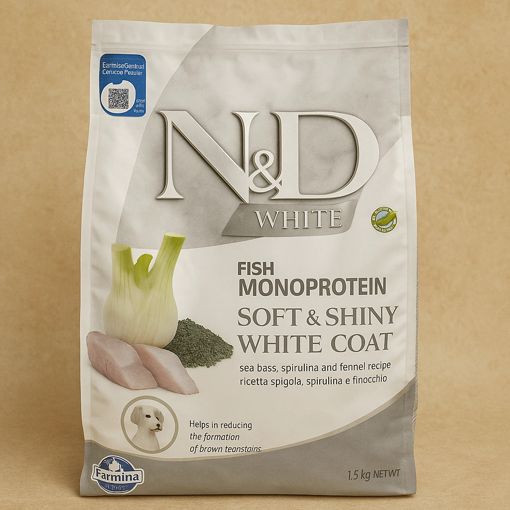 Elaborado con lubina fresca, espirulina y hinojo, ingredientes que ayudan a reducir las manchas de oxidación del pelo y mantener un manto blanco, brillante y saludable. Su fórmula aporta antioxidantes naturales y ácidos grasos que cuidan la piel y el sistema inmunitario.